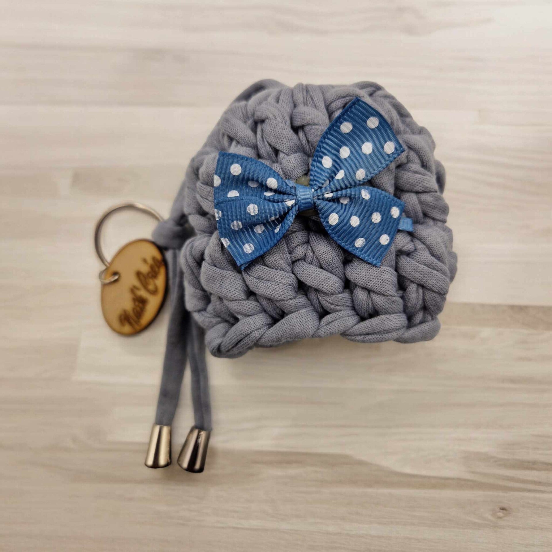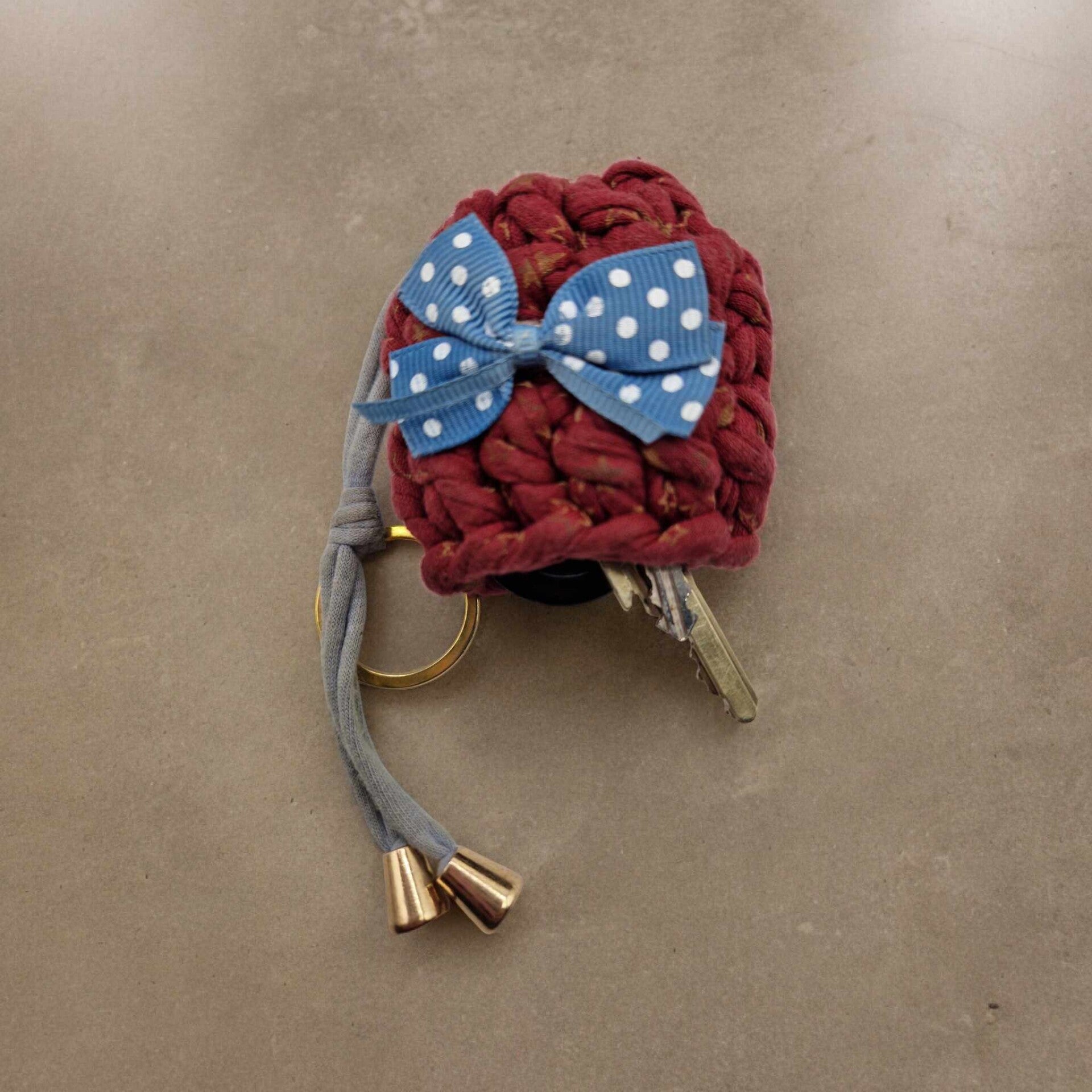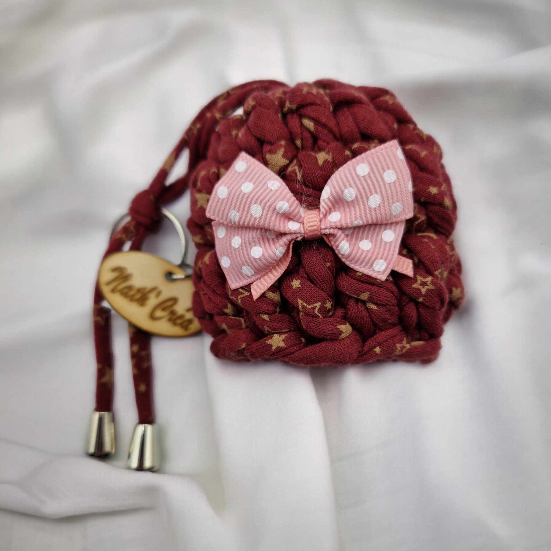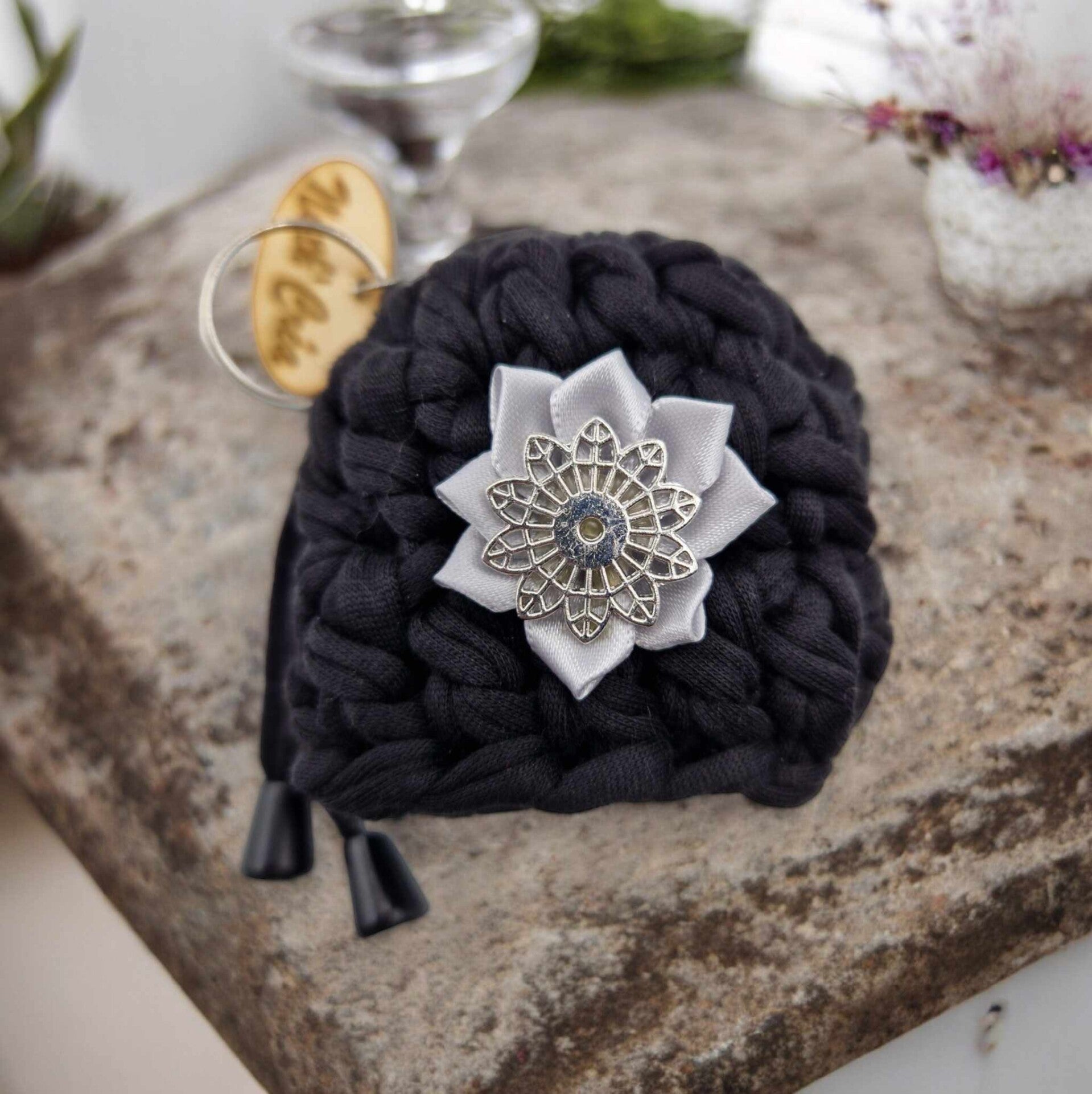 Il est confectionné avec du Tee shirt recyclé (bobilon yarn), orné de fleur en satin ou d'un noeud, agrémenté de cache noeud et d'anneaux porte clés.