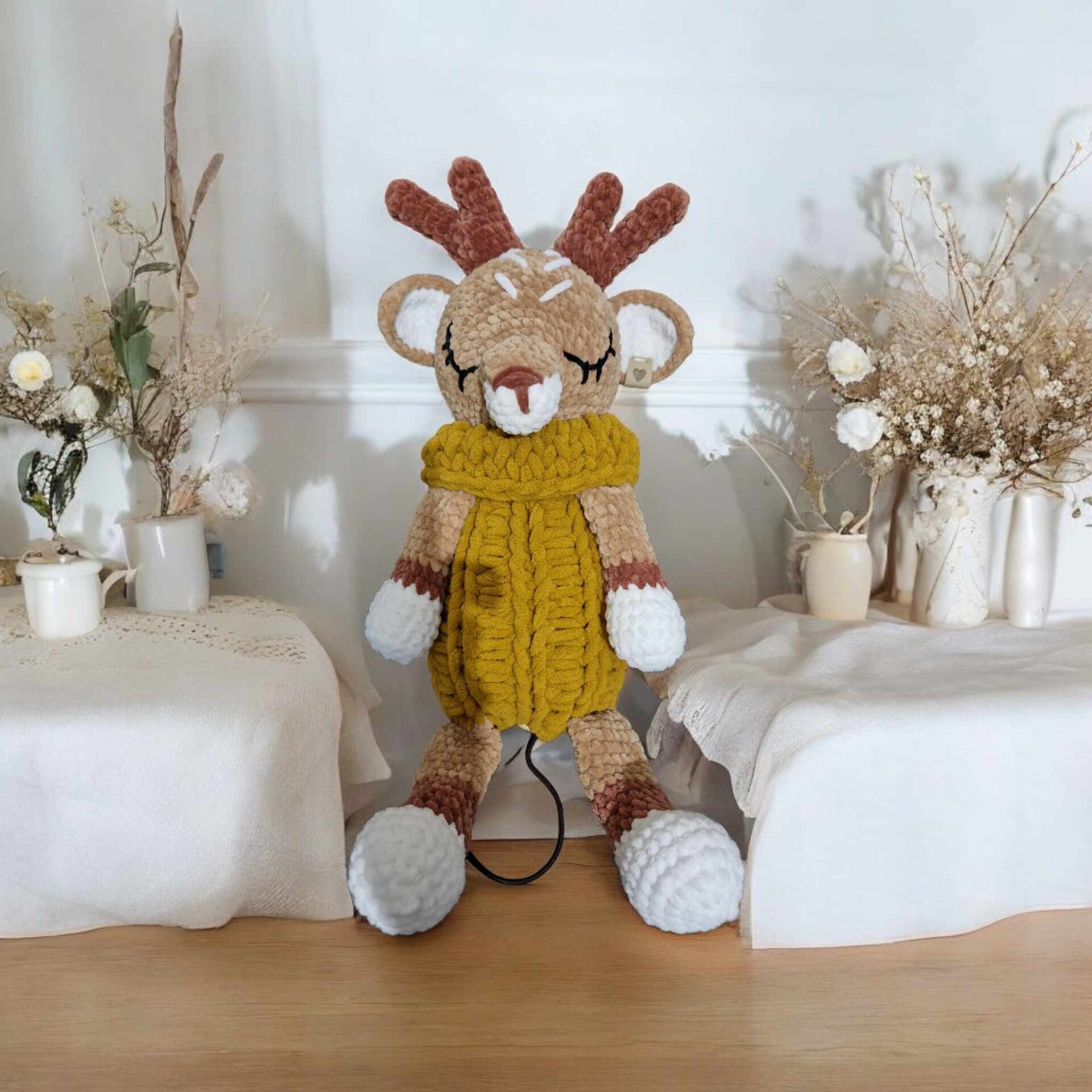 3 en 1, range pyjama, peluche et sac à dos accompagné de son porte clé cerf réalisé au laser.